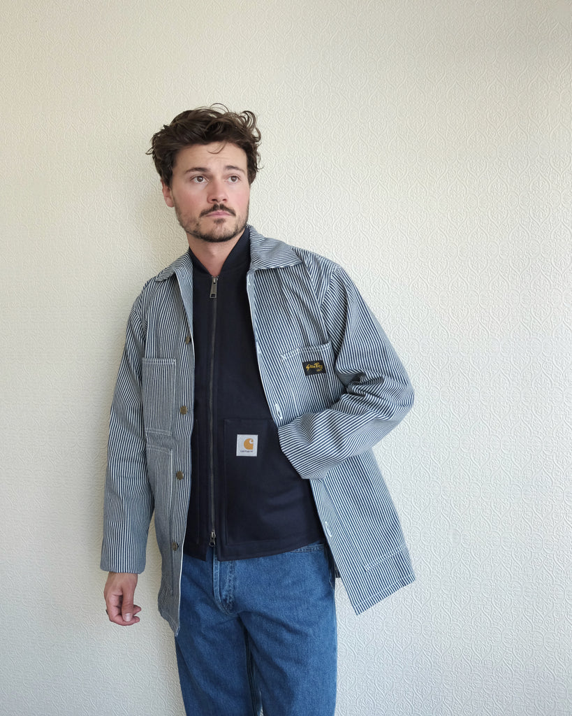 Light weight hickory stripe shop coat from Stan Ray, 100% cotton. Made in USA.