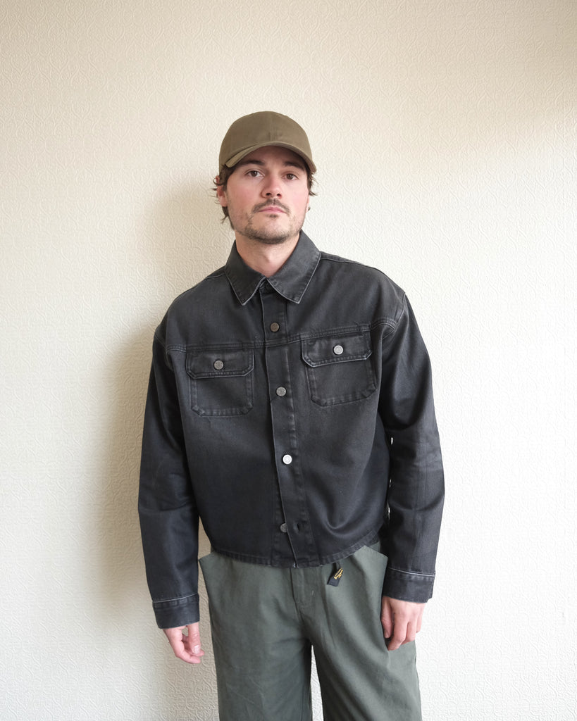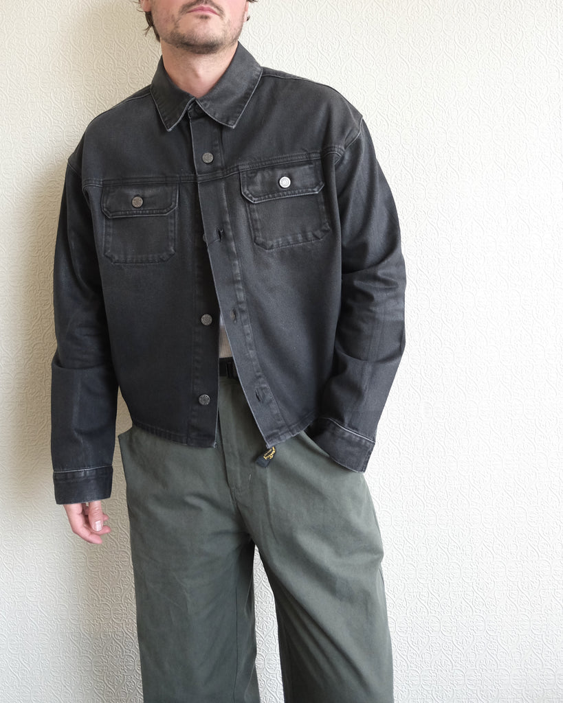 The shirt is made from organic cotton in a warm black wash with a coating added on top.