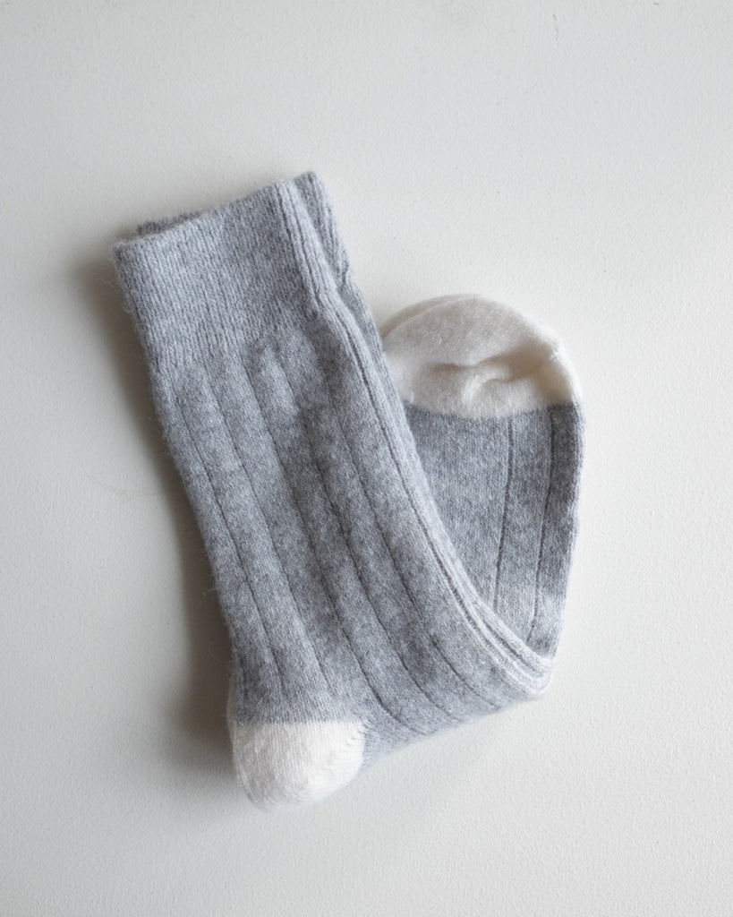 A Cashmere blended sock with a wide ribbing detail and tonal contrasting heel and toe. Classic Cashmere Socks is a revival of a more antiquated style from days of tailored clothing and fresh milk bottle deliveries at dawn. She daydreams of homesteading with her beloved, wild flowers in her garden and the scent of fresh baked bread filling the kitchen. We love to style her with corduroy, clunky loafers, and a good coat.