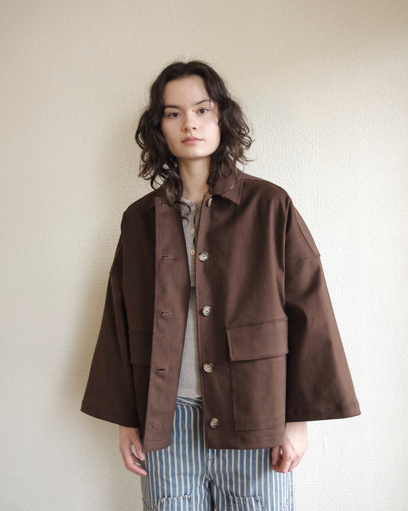 Short flared trench coat with lapel collar and long sleeves. Side pockets. Front closure with buttons.