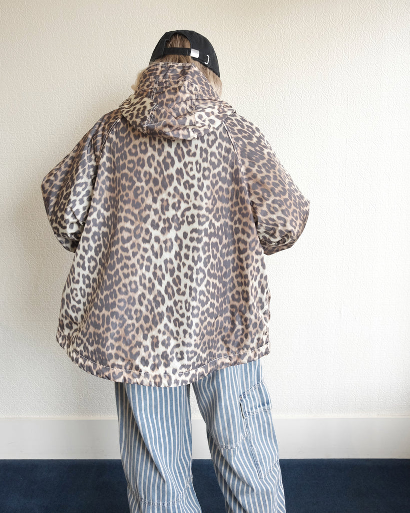 This jacket features a leopard print design with a front zip closure and a hood. The jacket has a patch with a GANNI logo on the chest. Oversize fit, consider buying a size smaller.