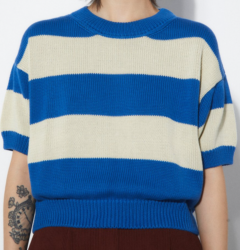Rita Row Pattie Sweater in blue and cream stripes. Slightly cropped with short sleeves in 100% cotton.