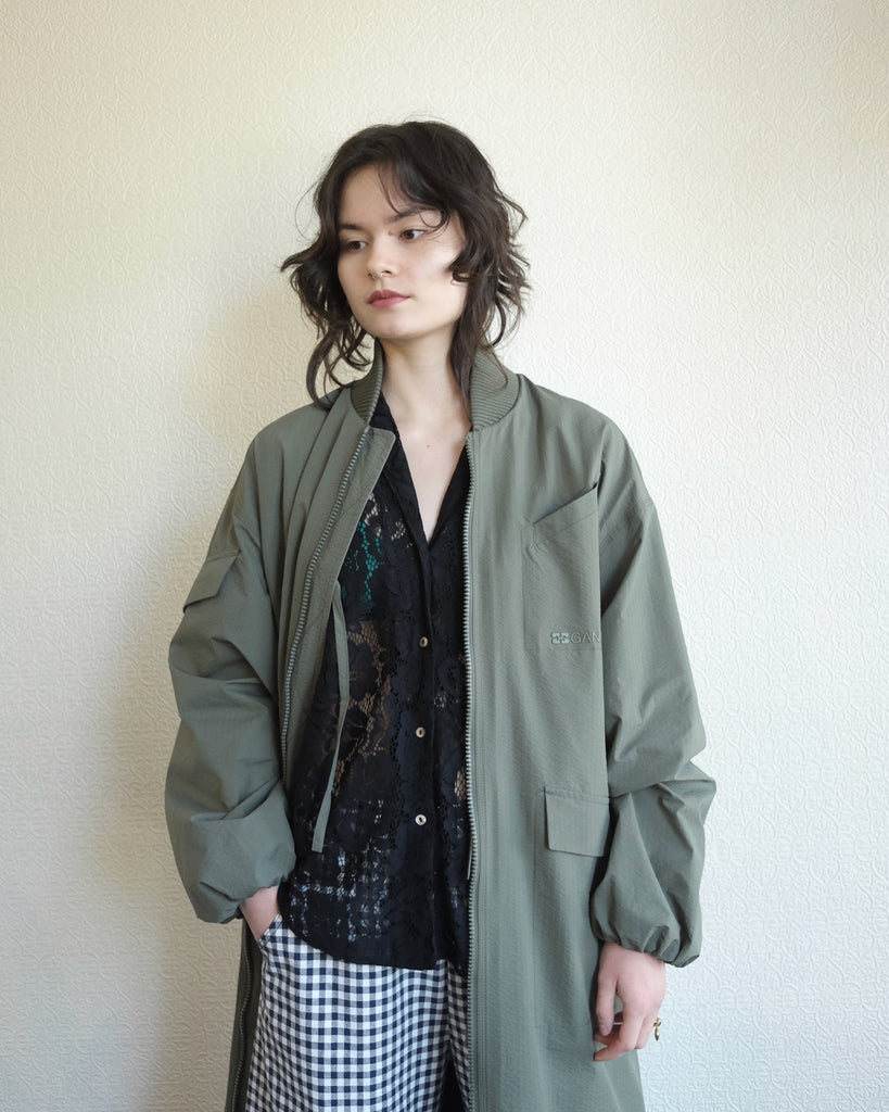 •  GANNI Beetle Green Tech Seersucker Oversized Shell Coat features a front zip closure, elastic detailing at the sleeve cuffs, and pockets at the sides, front, and on one sleeve.